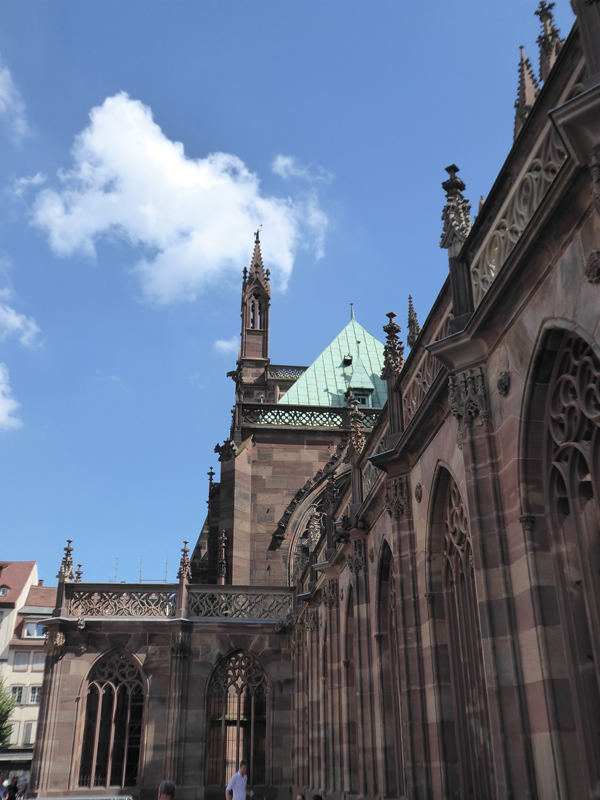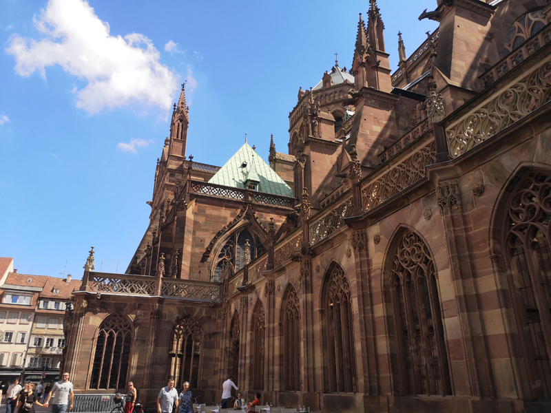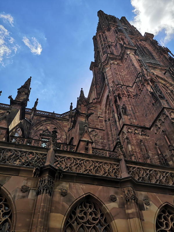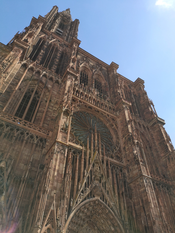 Bzw. die Cathédrale Notre-Dame de Strasbourg, wie es korrekt heißt! Eigentlich hätten wir schon reingewollt … aber in Zeiten von Corona geht das nicht so einfach, der Einlass war in 10er Gruppen vorgesehen, vor uns waren bereits mehr als 10 in Warteposition und wir konnten keinen zeitlichen Fortschritt erkennen …. also sind wir lediglich außen herum – auch schön!