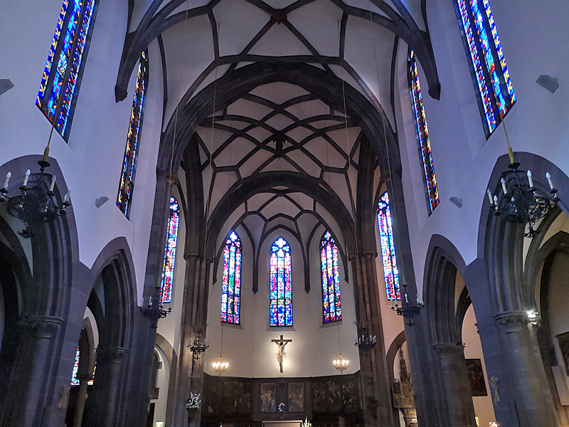 Auf dem Rückweg sind wir dann an der offen zugänglichen, ohne Warteschlange ausgestatteten St.-Pierre-le-Vieux vorbeigekommen. Wie man bei Wikipedia nachlesen kann, ist das eine Kirche beiderlei Geschlechts – will sagen katholisch und protestantisch, aber das wussten wir vorher nicht und haben es deswegen auch nicht registriert … ich schätze, wir waren im katholischen Teil, aber den Stempel der ignoranten Deutschen nehmen wir hiermit schamvoll an!