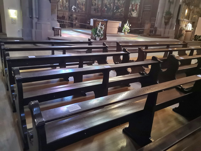 Weihwasser ist coronär bedingt out, stattdessen gibt es Händedesinfektionsmittel und auf den Bänken ist angegeben, wieviele Leute, ausgehend vom Familienverbund, Platz finden dürfen.