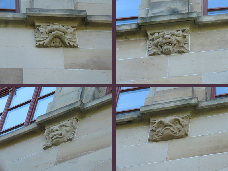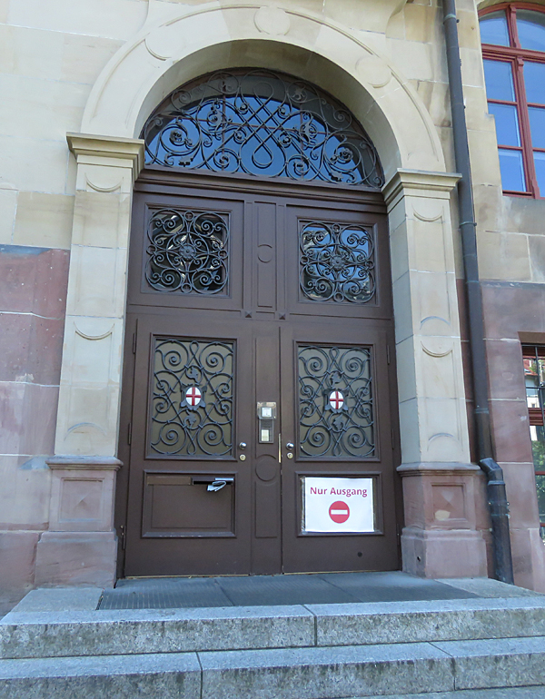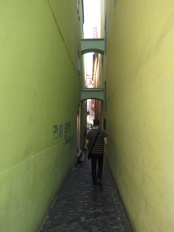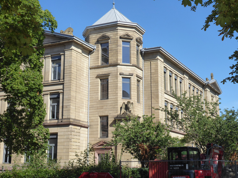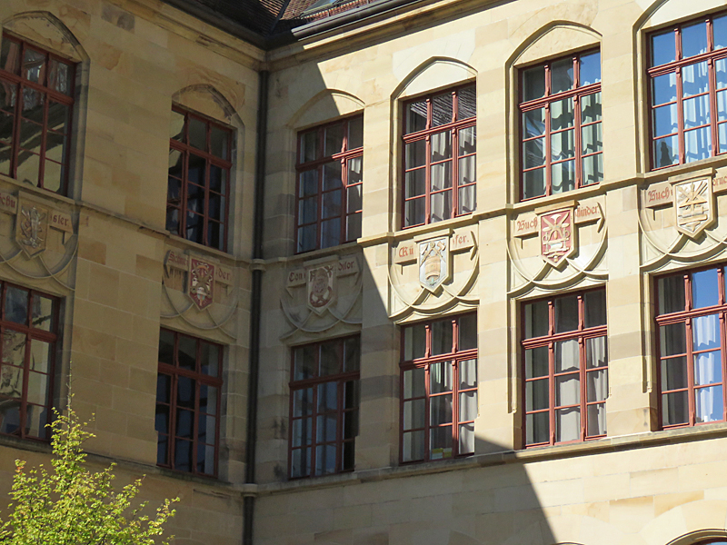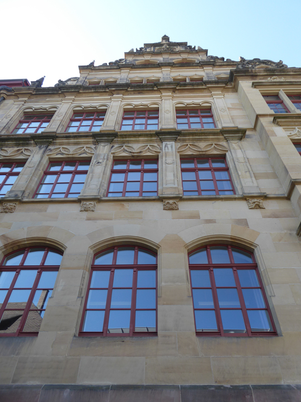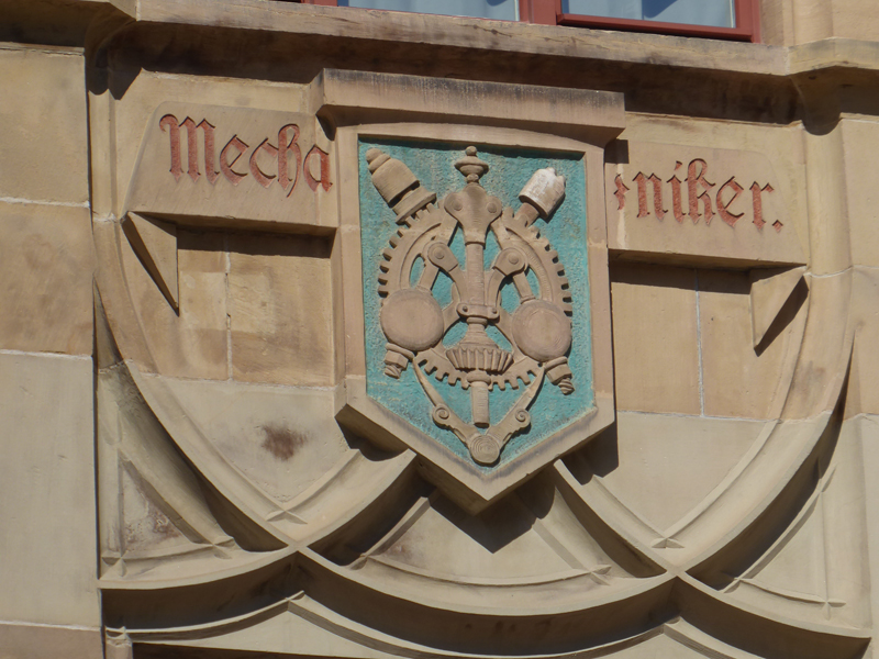 Wir orientierten uns dann an Kirch- oder anderen Turmspitzen, tauchten immer mal aus der „Kanalisation“ auf und schauten, was die Oberwelt so bot, und landeten dann vor dem denkmalgeschützten Teil der Gertrud-Luckner-Gewerbeschule, der „Staedtischen Gewerbeschule Freiburg“ mit unglaublicher Fassade. Es erinnerte kolossal an Hogwarts, wie T so treffend bemerkte.