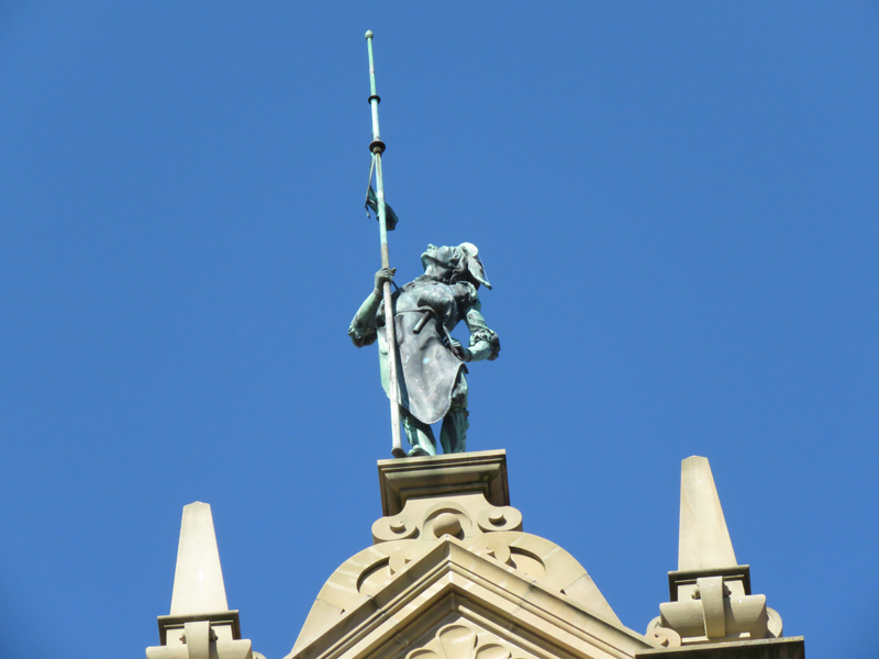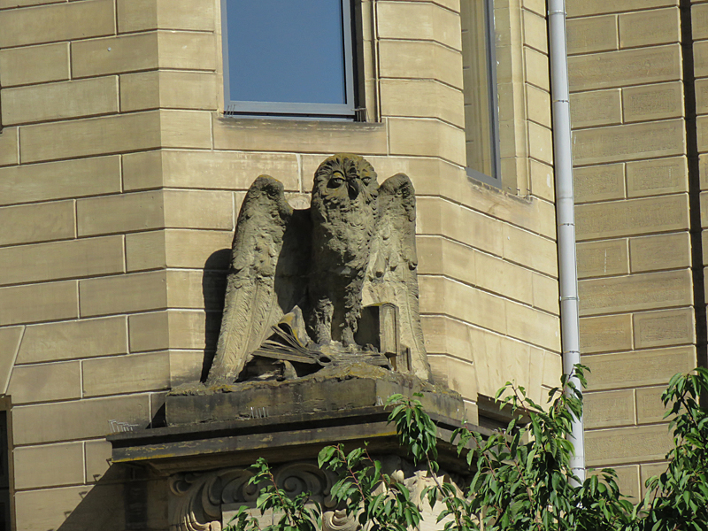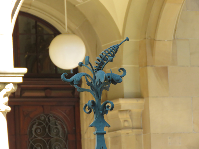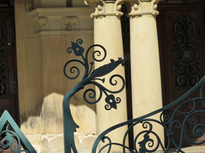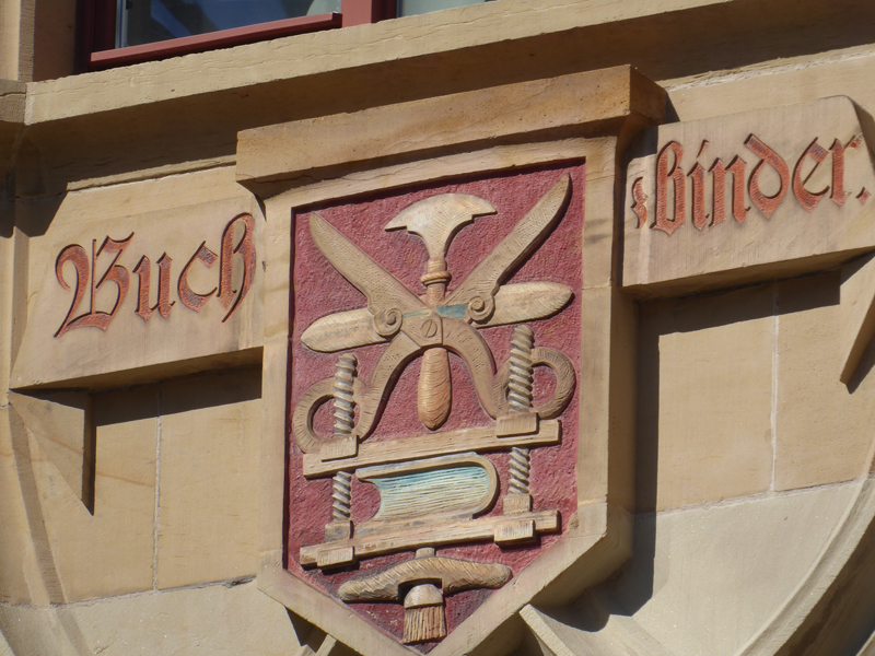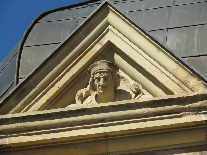 Wir orientierten uns dann an Kirch- oder anderen Turmspitzen, tauchten immer mal aus der „Kanalisation“ auf und schauten, was die Oberwelt so bot, und landeten dann vor dem denkmalgeschützten Teil der Gertrud-Luckner-Gewerbeschule, der „Staedtischen Gewerbeschule Freiburg“ mit unglaublicher Fassade. Es erinnerte kolossal an Hogwarts, wie T so treffend bemerkte.