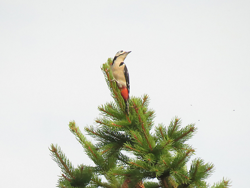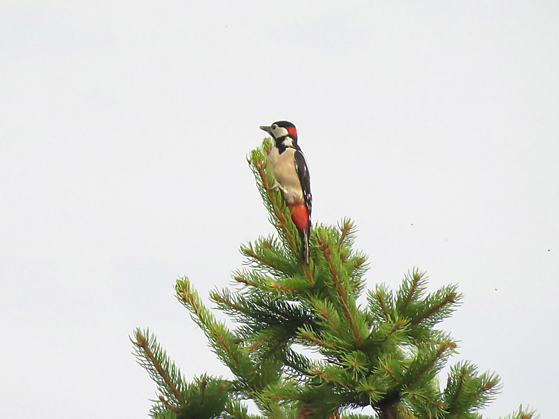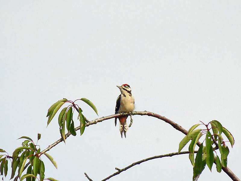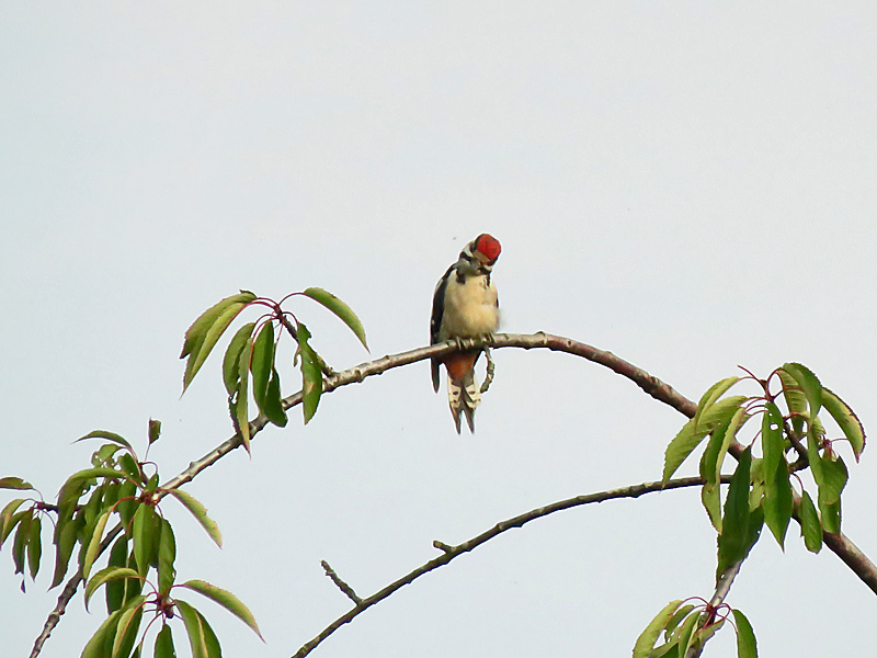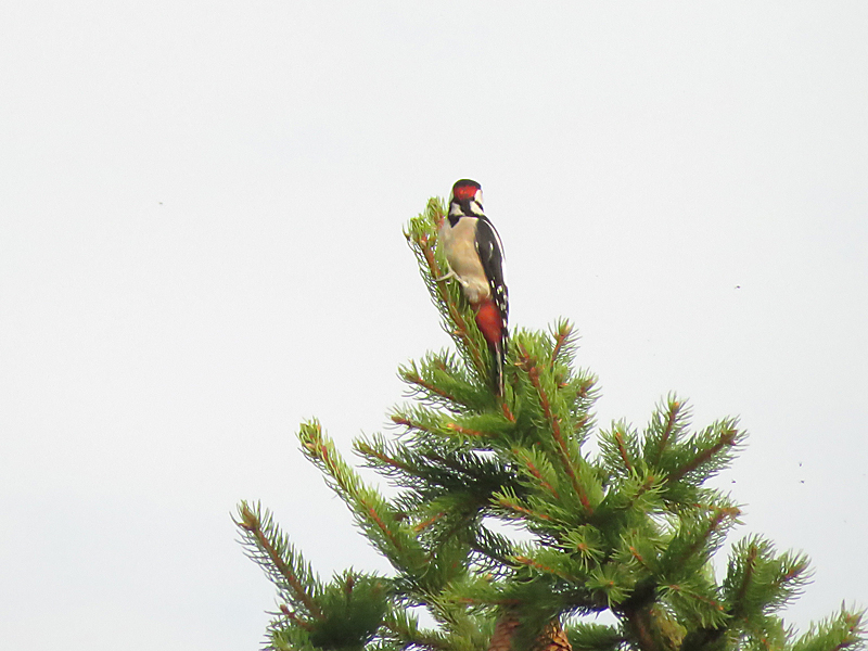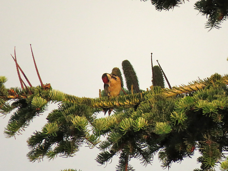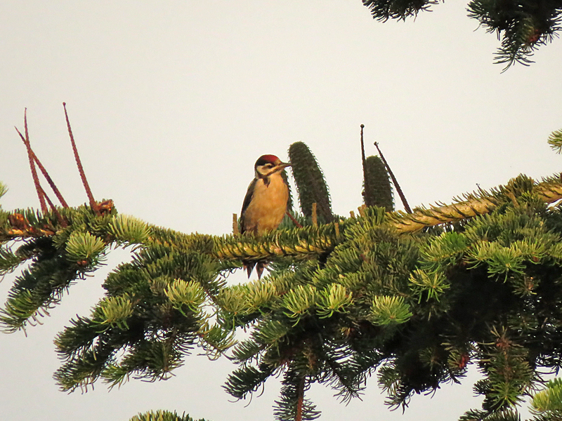 Und dann gab es doch noch einen Welpen! Vom Buntspecht, Welpe auf Laubbaum (roter Scheitel) und Vater auf Nadelbaum (roter Hinterkopffleck)