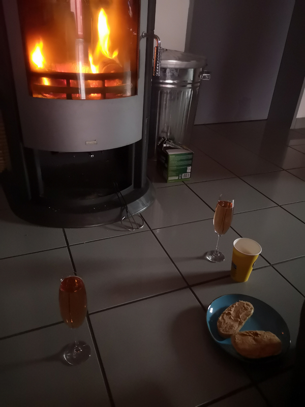 20:45 h – Westnetz sorgt für intime Gemütlichkeitnein, draußen sind keine Lichter, das ist die Spiegelung!noch brauchen wir keinen Kaminaber am Morgen nach gut 12 Stunden , wurde es mangels stromversorgter Fußbodenheizung etwas früschder wartete seit 20 Jahren auf seinen Einsatz, jetzt versorgte er uns mit Teewasser