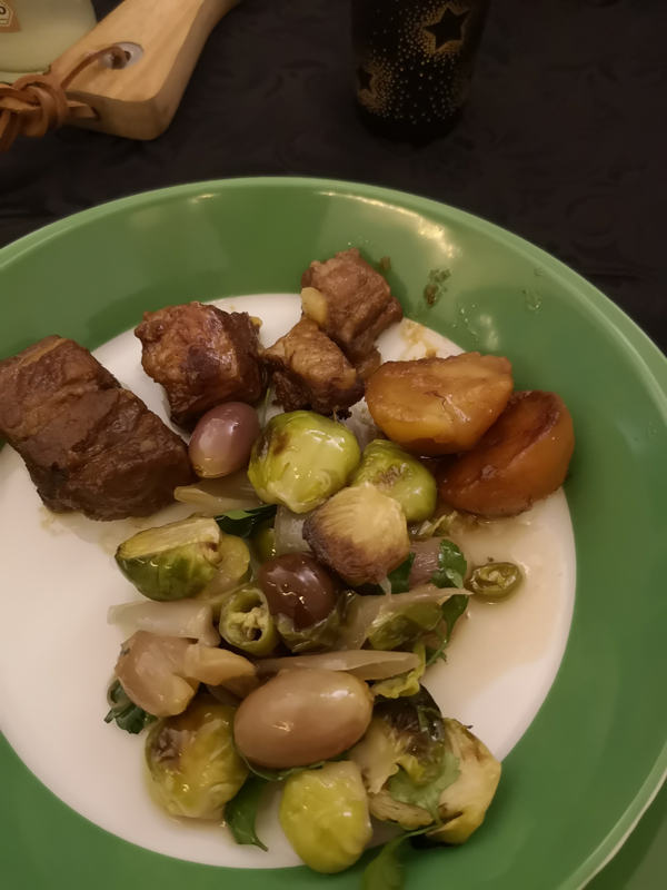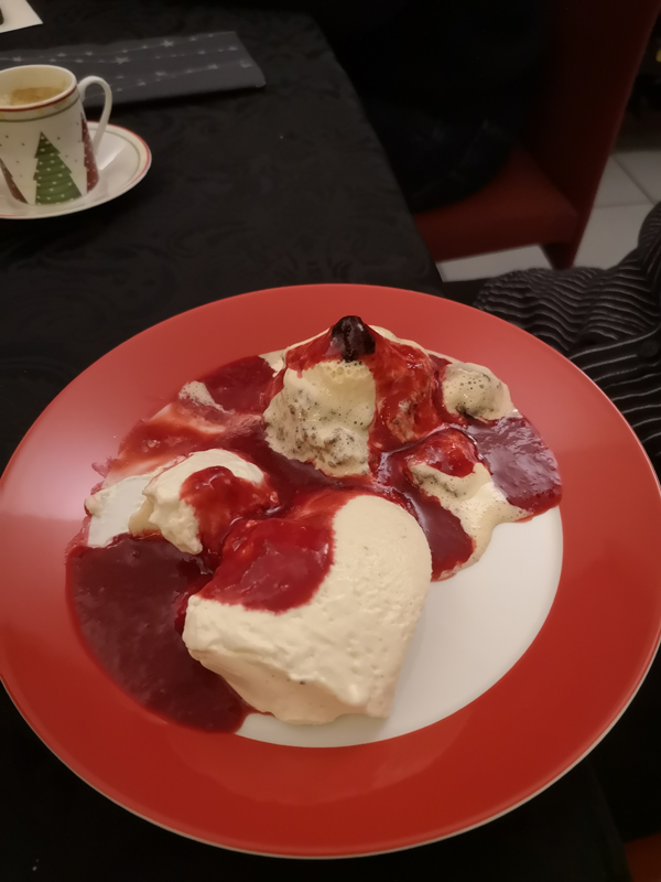 Neulich in Holland kennengelernt, Wraps! Mit Meerrettich-Frischkäse und Räucherlachs, sowie Toskana-Frischkäse und Kochschinken/PaprikaHokkaido-Kürbissuppe auf OrangensaftbasisSchweinebauch by JingruLeghis Rosenkohl by JuliaFeldsalat mit Orangenfilets und KirschtomatenConfierte Entenbrust mit badischen Kartoffelnknöseln und gemischten Bohnen by usKeks-Tiramisu mit Amarenakirschen udn Marzipan-Crème mit entkernter HimbeersauceEierlikör by the one and only Tdie Contributanten – by Anja unter Einsatz ihres Weihnachtsgeschenkes festgehaltenGebrüder Grimm-Geller