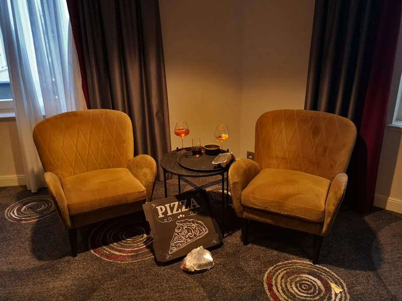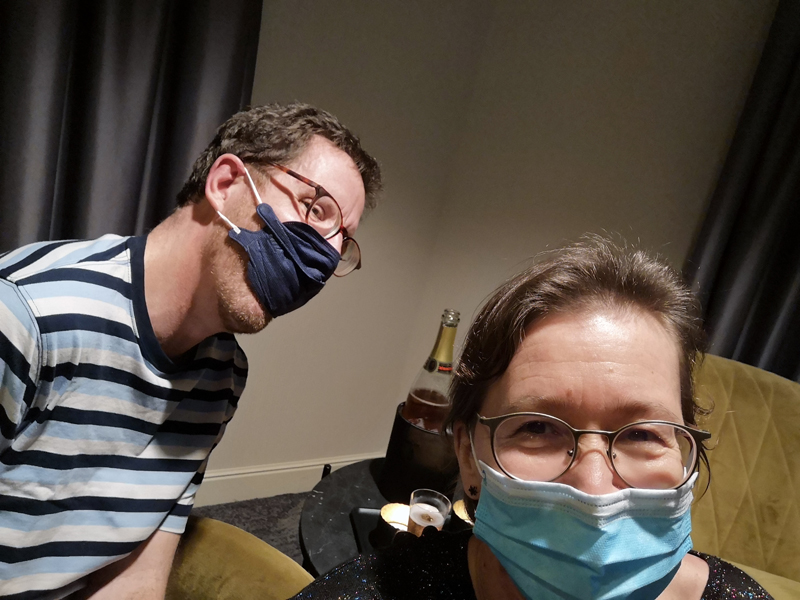 Natürlich gibt es auch am Silvesterabend in Brüssel 24/7-Supermärkte und so konnten wir zusätzlich zu unserem mitgebrachten comme d’habitude-Fisch auch noch Baguette, Käse, Bier und Gin Tonic erstehen. Denn: das Silvester-Dinner im Hilton war selbstverständlich längst ausverkauft. Das hätte man uns aber auf unsere Anfrage Ende Oktober bei der Buchung auch mitteilen können. Stattdessen kam eine Standard-Mail mit der Info, dass man Corona-bedingt auf dem Zimmer abendessen und auch frühstücken solle. Ohnehin fühlten wir uns bei der offen zur Schau gestellten allgemeinen Sorglosigkeit auf dem Zimmer wohler und auch „sicherer“.