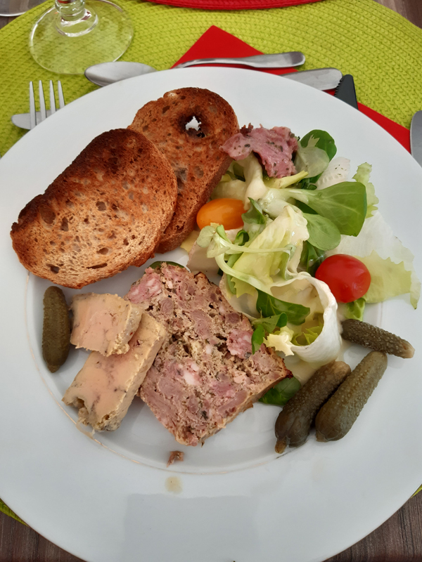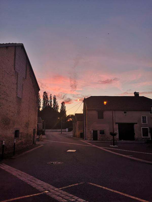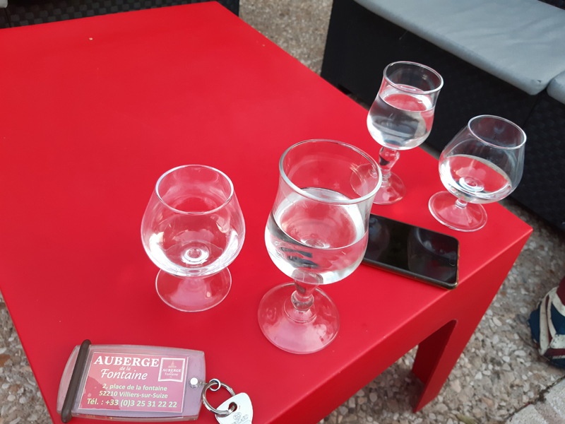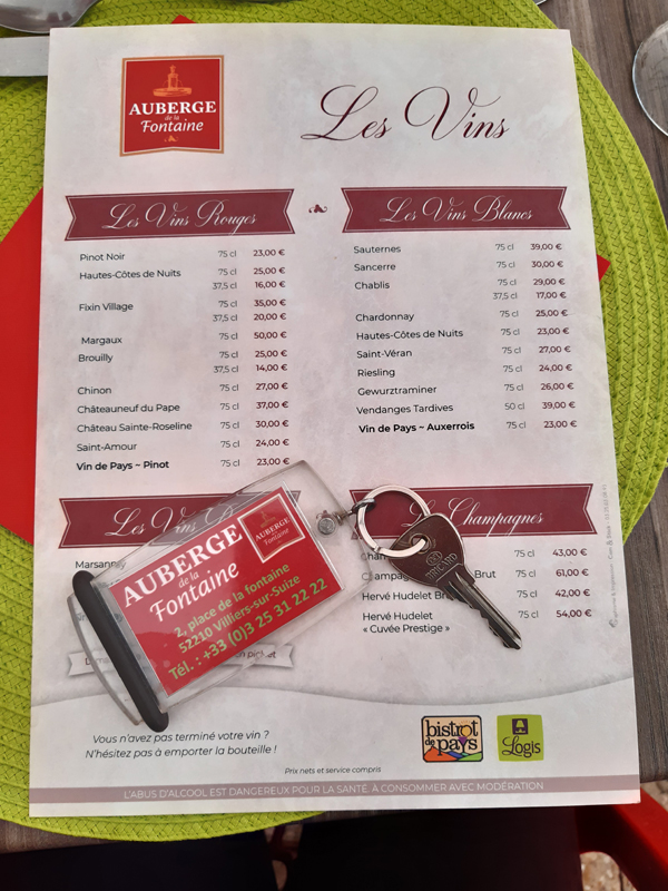 Nachdem die Schweizer Reisegefährten, die zeitgleich mit uns an unserer ersten Station waren, sagten, dass sie nun, auf ihrer letzten Station, kaum noch Platz für den leckeren Font Alba-Wein im Auto hätten, blieben wir zurückhaltend. Allerdings fanden wir unterwegs keinen leckereren Wein und meldeten uns daher auf der Heimfahrt erneut bei Anne-Sophie an und erstanden weitere caisses genannte Kartons. Bei der Gelegenheit kauften wir dann auch noch mal von der vermeintlich leckeren Lavendelpastete im lokalen Intermarché und fuhren dann nach Villiers sur Suize zu unserer Zwischenübernachtung in der Auberge de la Fontaine: