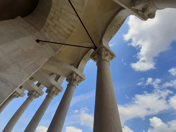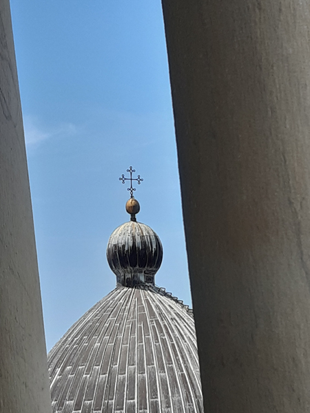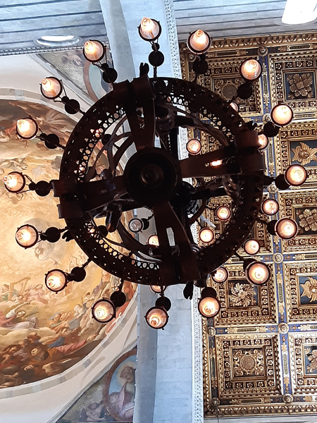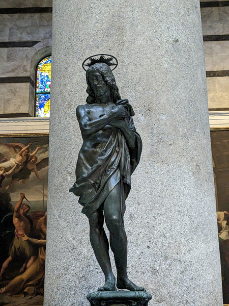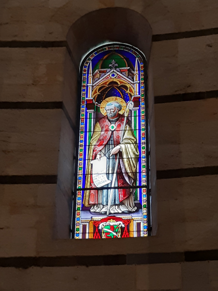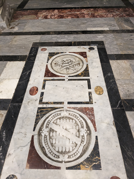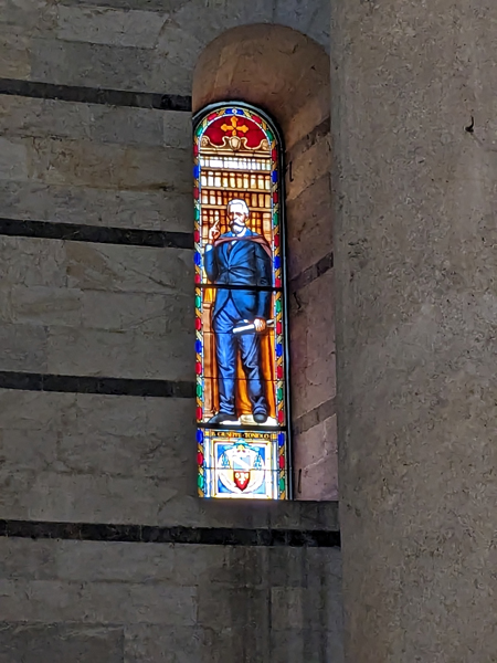 schicker Bodendie cupola wird wohl gerade restauriertdiese Figur lässt jetzt leichte Reminiszenzen an Game of Thrones erwachendie nächsten Löwenund die nächsten TotenschädelBlick durchs offene Emporenfenstermal kein Heiliger im Buntglasfensterangeblich Johannes der Täufer – wir bleiben bei GoT