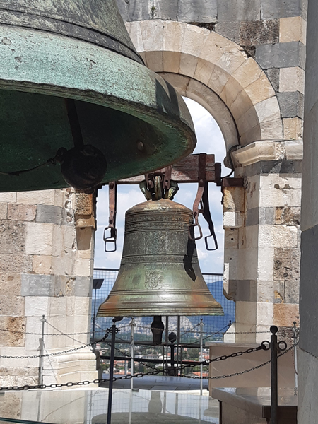 sieht aus wie ein Schornsteindie Eingangstür ist eindeutig schief!was einem vorher gar nicht so klar ist: man wendelt sich da auch selbst hoch, mit Schlagseite also, sehr unkommodnicht so easy, Fotos ohne Gitterabsperrung zu knipsen!diese Glocken blieben auch stummga de rotonde rond!