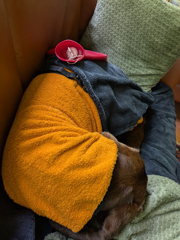 Da kann man sich als Hund dann schon mal übernehmen und einen Aua-Po sich zuziehen. Aber mit der Wärmflasche wurde es dann doch schnell besser.