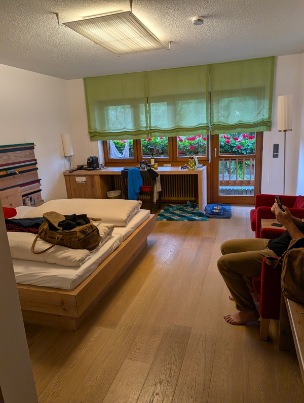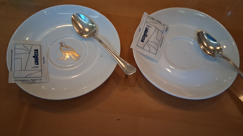 Am Morgen danachkleine VorfrühstücksrundeHotel-Parkplatz und Hinter-Eingangzwischen Frankreich und Italien passt ein Duster!leichtsinnigerweise hatten wir das Gourmet-Frühstück bestellt …haben wir bekommen!hätte auch für 4 gereicht!schöner Ausflug, cheers!