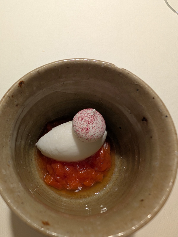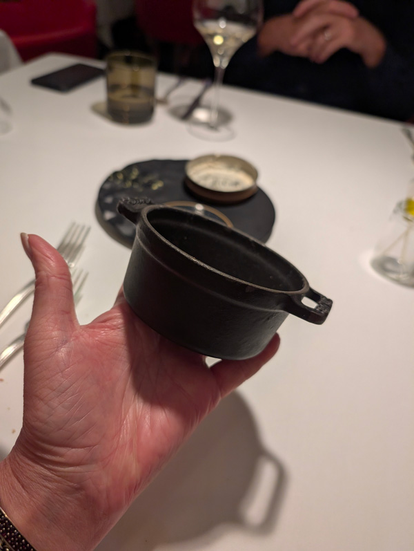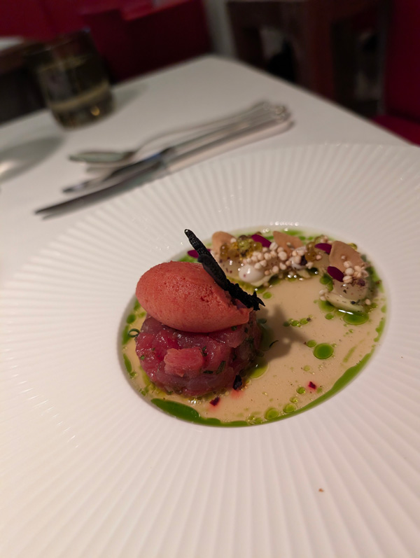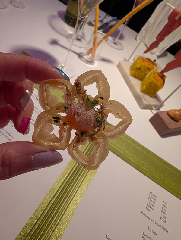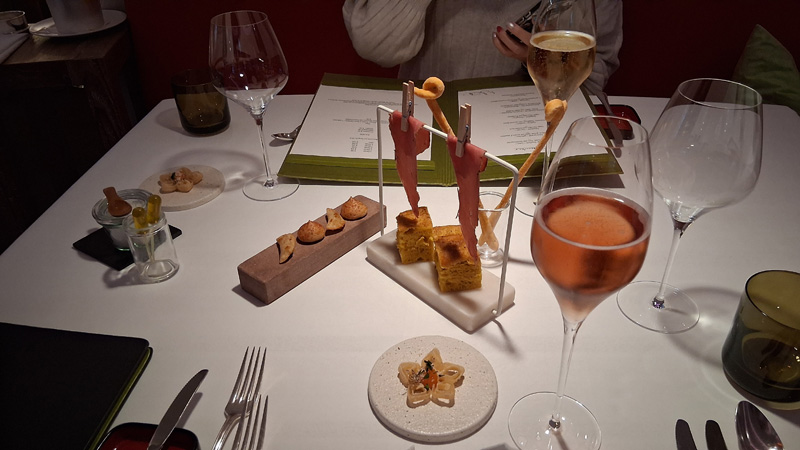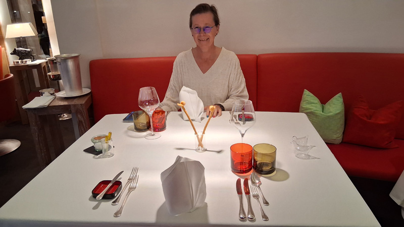 Nach dem Kaffee (ohne Kuchen), ging es noch kurz aufs Zimmer und dannnnn: 6-Gang-Menue, weil Mme nicht wusste, was sie von der Karte NICHT essen wollte ….dann also doch das fast volle Programm!